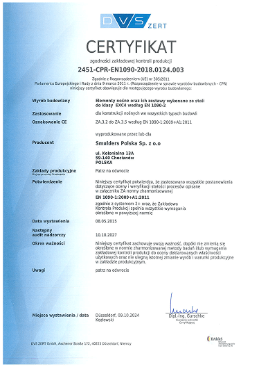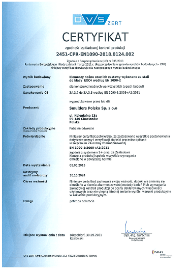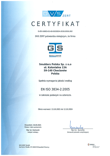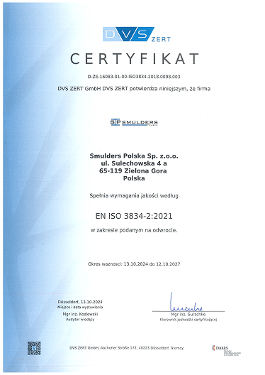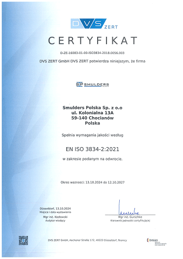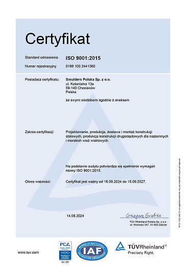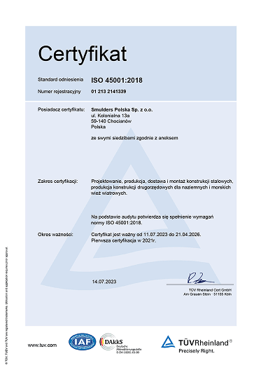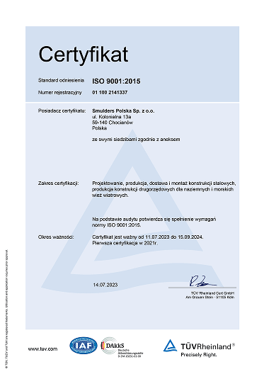 W Smulders Polska stawiamy na najwyższe standardy jakości i bezpieczeństwa, co potwierdzają liczne uzyskane przez nas certyfikaty. Nasza firma od lat angażuje się w doskonalenie procesów produkcyjnych i operacyjnych, zapewniając klientom produkty, które spełniają najbardziej rygorystyczne wymagania branżowe. Prezentujemy nasze najważniejsze certyfikaty, które są dowodem zaangażowania Smulders Polska w jakość, bezpieczeństwo i zrównoważony rozwój.